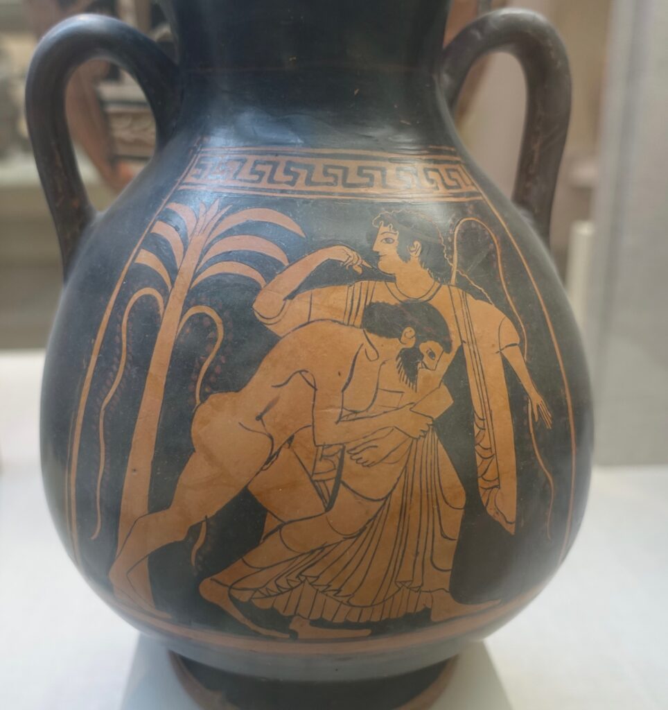 The painting on the above Greek vase shows the mortal Peleus wooing the Greek Nereid (a form of minor goddess) Thetis. Peleus was one of the Argonauts that accompanied Jason when he went for the golden fleece. Zeus and Poseidon had previously had eyes on the beautiful Thetis, but a prophesy said her son would be stronger than his father. They kept away. The Greeks did not have dating apps, but Zeus himself introduced Peleus to Thetis. She played hard to get and ran away. Peleus had to catch Thetis and wrestle her to the ground to win her hand in marriage. Looking at the image you might think she should have sprawled and stuffed his head, but his set up was good and he penetrated deeply and completed the takedown. They had a magnificent wedding and all the gods and goddesses were invited. Achilles was the fruit of their union. He was a “hero.”