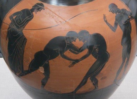 See the image on the vase. It appears that the wrestler on the right does not have a proper stance. His left leg is very exposed. To see comments and a video on stance [click here].