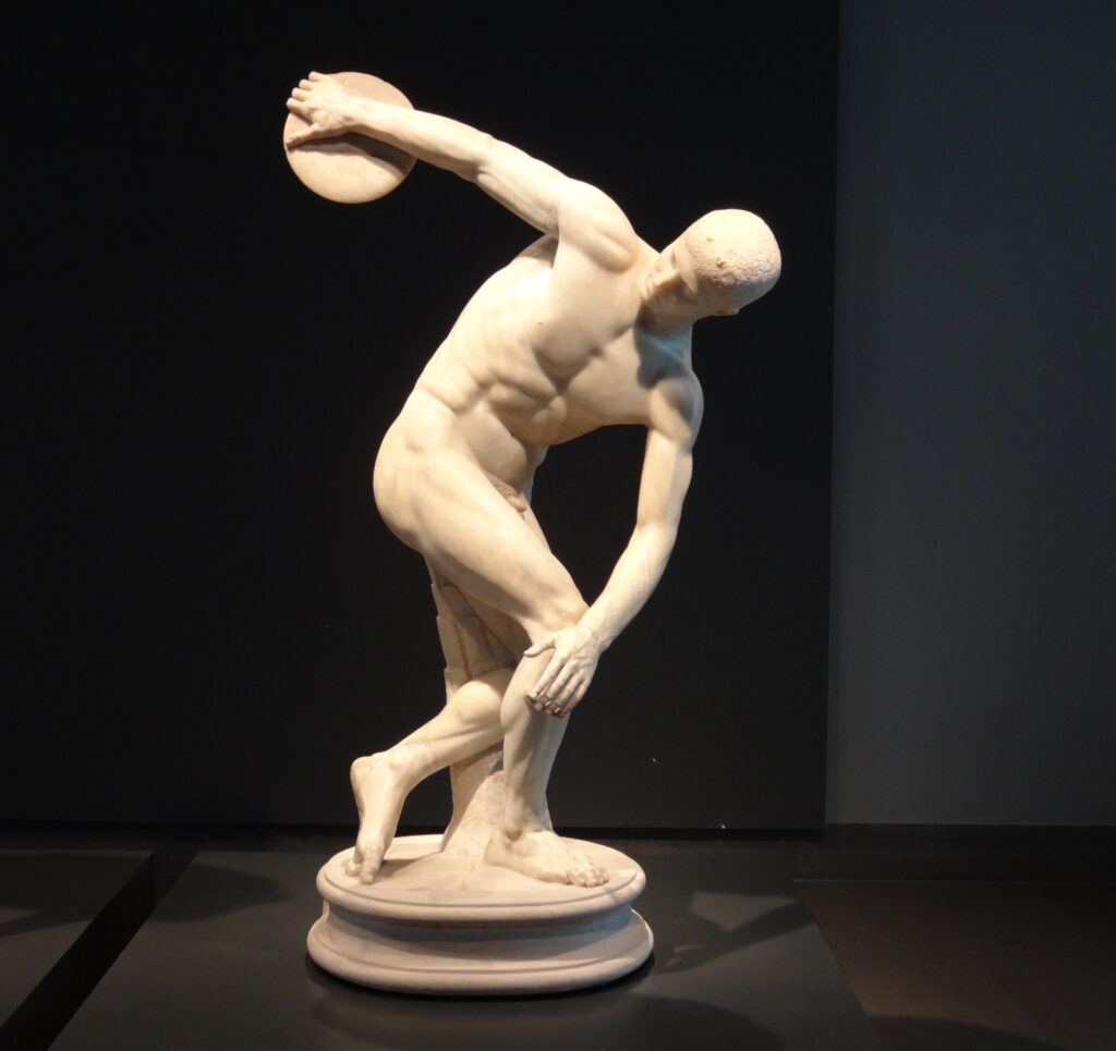 This is a Roman copy of an earlier Greek bronze sculpture. The Greek original was created in about 460 – 450 B.C.
